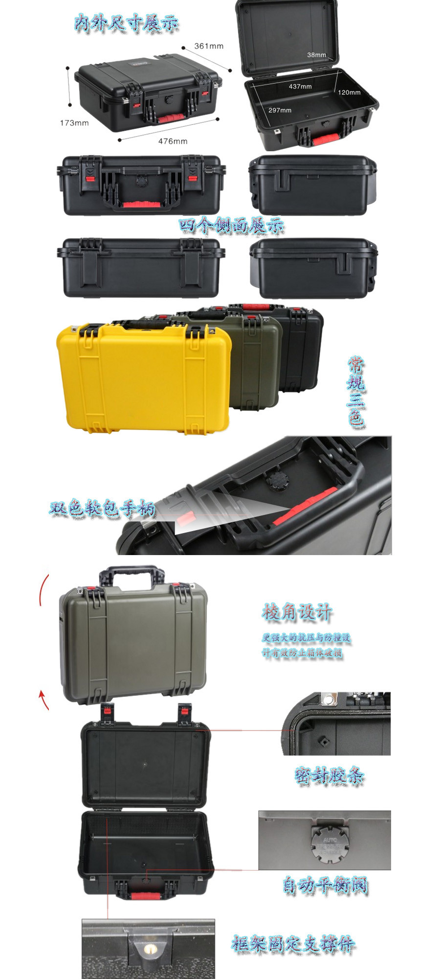 簡要說明:廣泛用于傳媒、公安、消防、軍隊(duì)、航空、戶外攝影、野外考察、科學(xué)探測等眾多領(lǐng)域的高端儀器、儀表。具有高強(qiáng)度、高抗壓沖擊、防潮、絕對密封、防塵、防水等特點(diǎn)。產(chǎn)品材質(zhì):ABS原料,箱體采用高抗沖擊的高分子聚合材料一體注塑成型,密封采用扁型彈性發(fā)泡密封橡膠條,確保防水氣密,所有較軸均采用不銹鋼材質(zhì)。