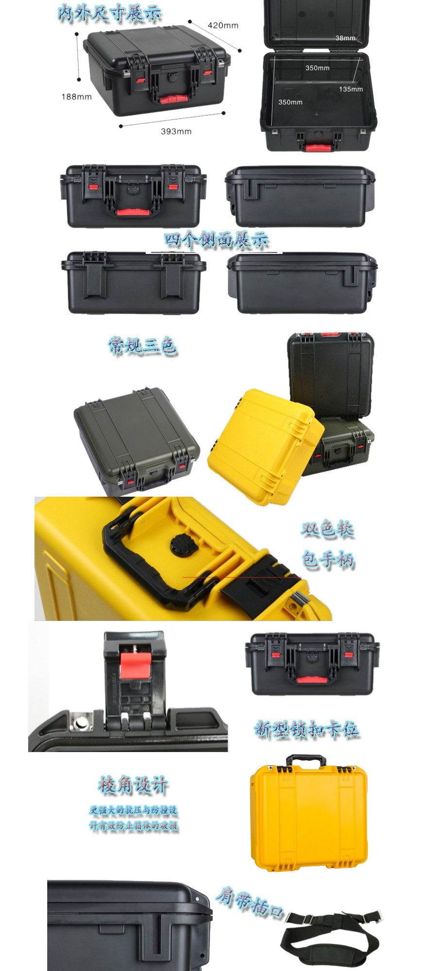 簡要說明:廣泛用于傳媒、公安、消防、軍隊、航空、戶外攝影、野外考察、科學(xué)探測等眾多領(lǐng)域的高端儀器、儀表。具有高強度、高抗壓沖擊、防潮、絕對密封、防塵、防水等特點。產(chǎn)品材質(zhì):ABS原料,箱體采用高抗沖擊的高分子聚合材料一體注塑成型,密封采用扁型彈性發(fā)泡密封橡膠條,確保防水氣密,所有較軸均采用不銹鋼材質(zhì)。