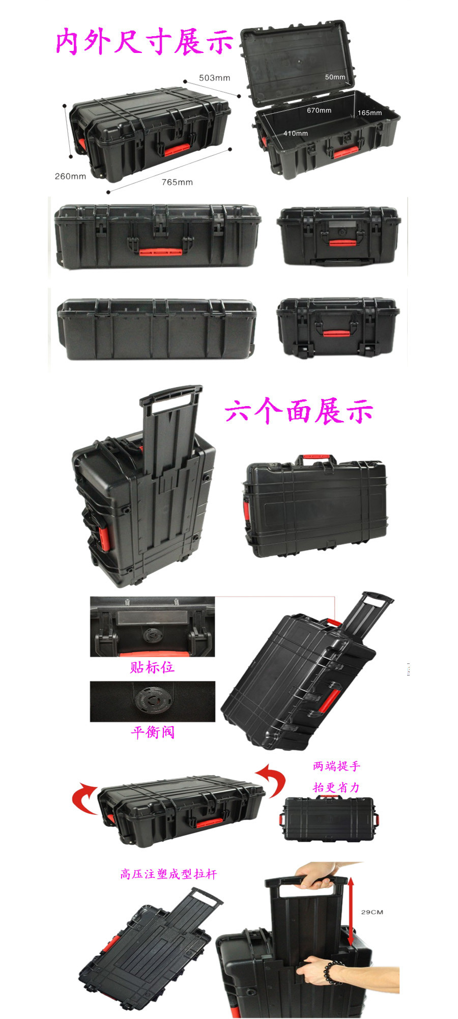 簡要說明:廣泛用于傳媒、公安、消防、軍隊(duì)、航空、戶外攝影、野外考察、科學(xué)探測等眾多領(lǐng)域的高端儀器、儀表。具有高強(qiáng)度、高抗壓沖擊、防潮、絕對密封、防塵、防水等特點(diǎn)。產(chǎn)品材質(zhì):ABS原料,箱體采用高抗沖擊的高分子聚合材料一體注塑成型,密封采用扁型彈性發(fā)泡密封橡膠條,確保防水氣密,所有較軸均采用不銹鋼材質(zhì)。